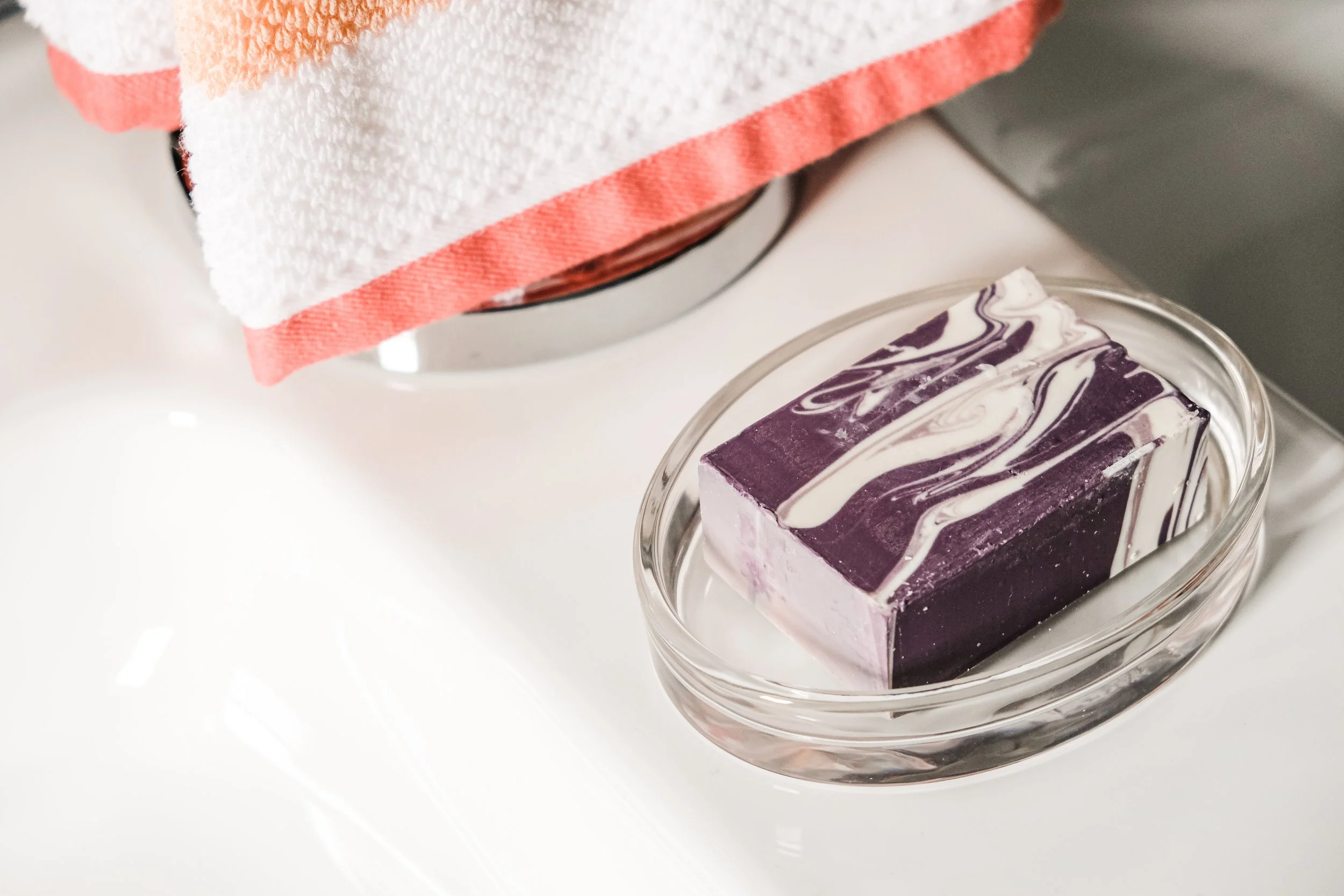 To maximize function in the space, we added storage at the double vanity with large drawers and medicine cabinets above. Step stools below tuck neatly out of the way when not in use. We also included a tiled “shelf” that spans the full width of the tub in lieu of a smaller traditional shower niche. A super durable, low-profile cast iron tub insert makes bathtime easy — for kids and the family dog, alike!